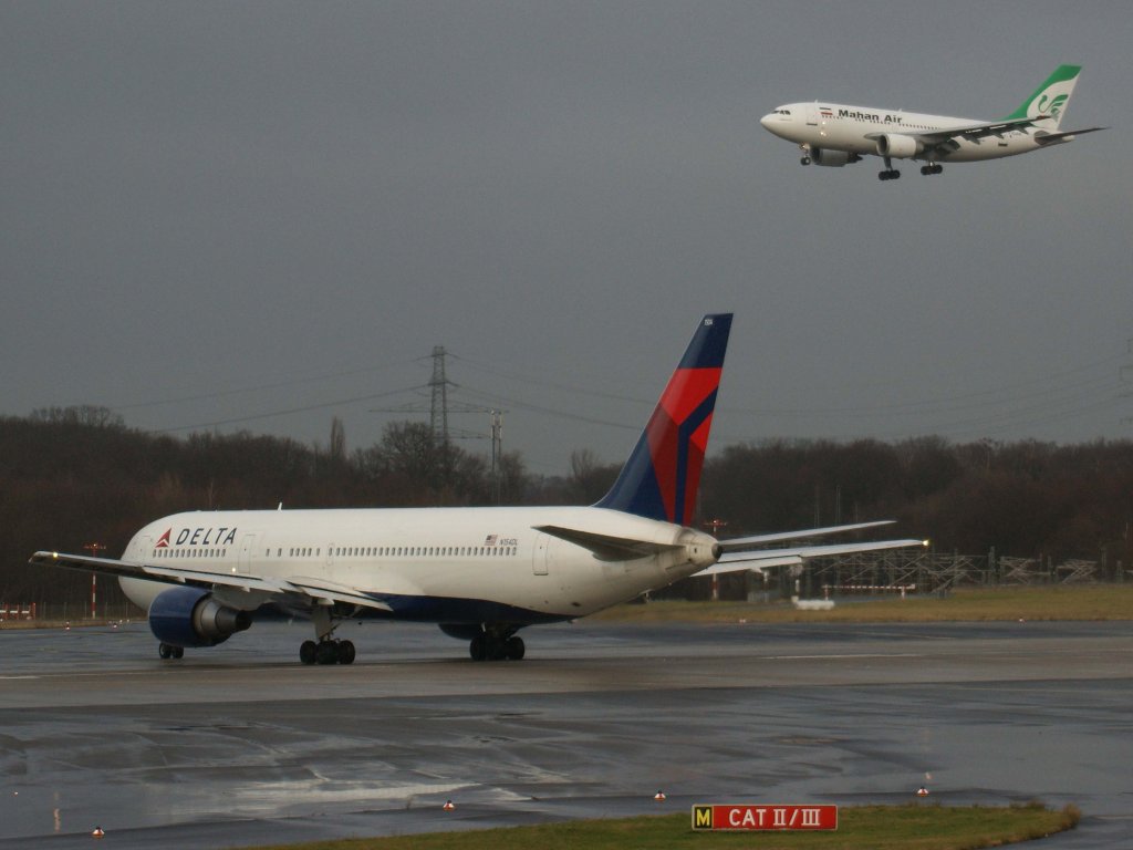 Delta Airlines, N154DL, Boeing, 767-300 ER (hinten landet Mahan Air F-OJHI), 06.01.2012, DUS-EDDL, Düsseldorf, Germany