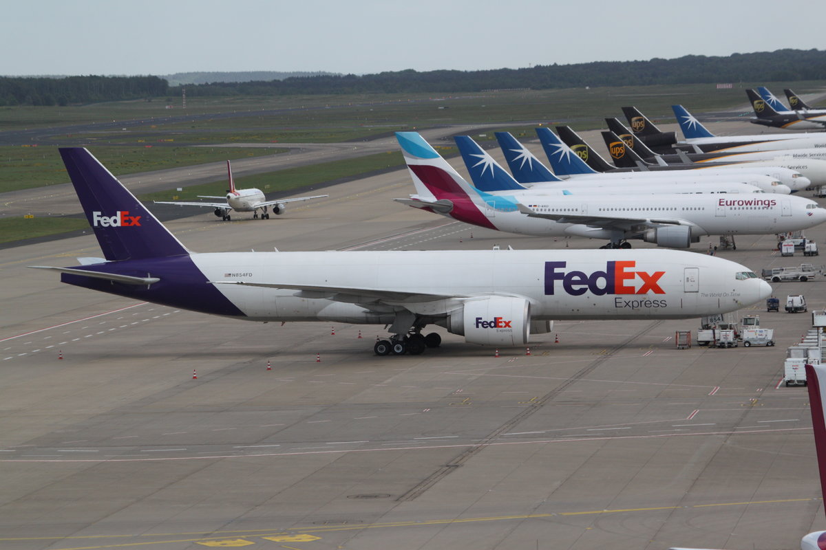 FedEx, N854FD, Boeing 777-FS2, CGN/EDDK, Köln-Bonn, 15.05.2016. Dahinter parkend die Eurowings D-AXGC (Airbus A330-203).