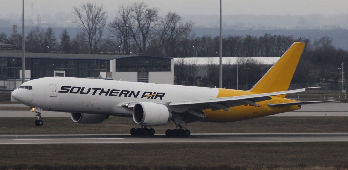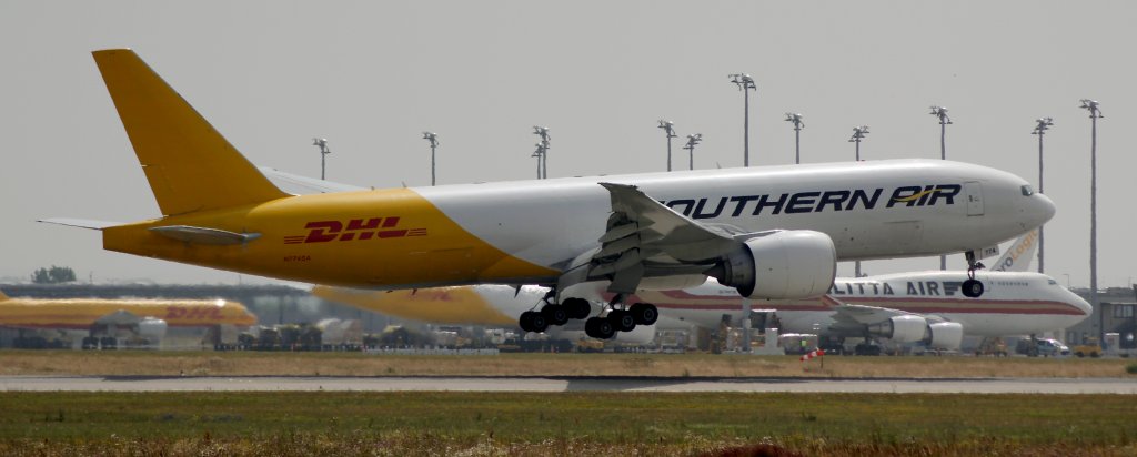 Boeing 777F der Southern Air (N774SA) bei der Landung auf dem Flughafen Leipzig/Halle. Fotografiert am 07.07.2013.