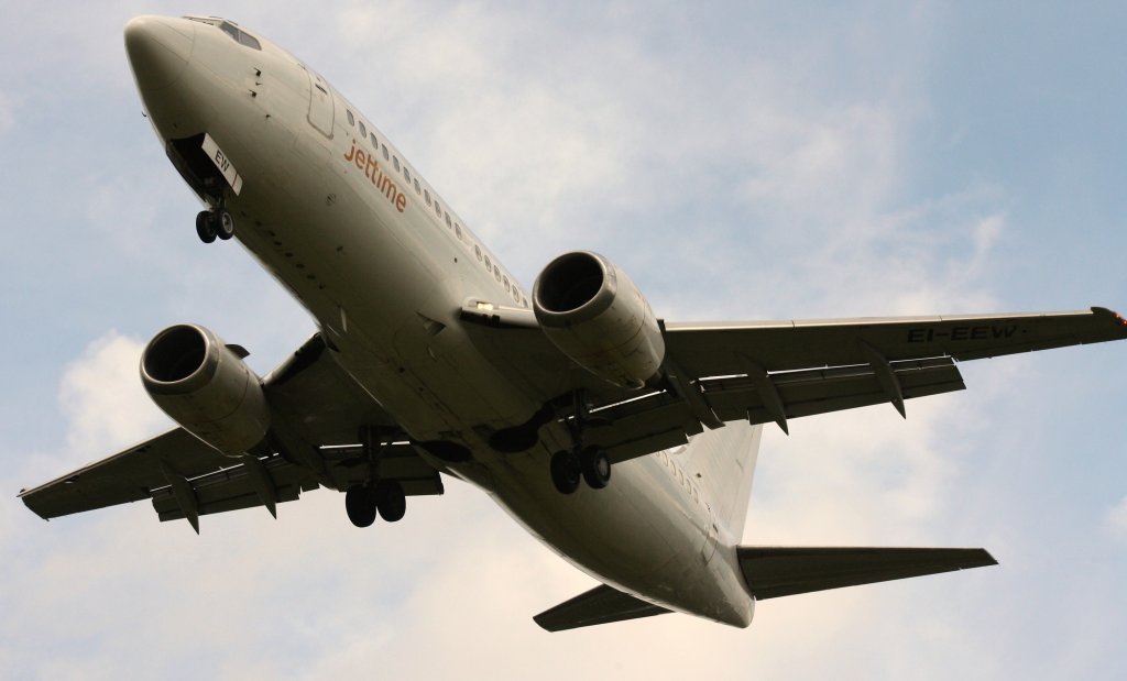 eine Boing 737-300 von Jettime im Landeanflug auf Friedrichshafen. Jettime flog Mitte April einige Flüge für die Intersky, hier am 24.04.2013