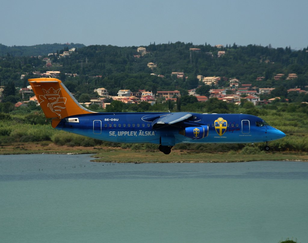 Malmö Aviation Avro Regjet RJ100 SE-DSU kurz vor der Landung in Korfu am 17.07.2010