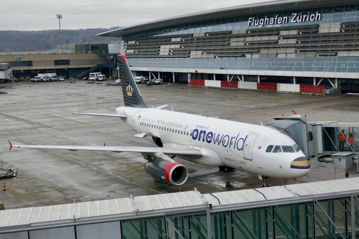 Royal Jordanian, A319-132, JY-AYP, Oneworld Livery, am 26.1.19 am Gate in Zürich.