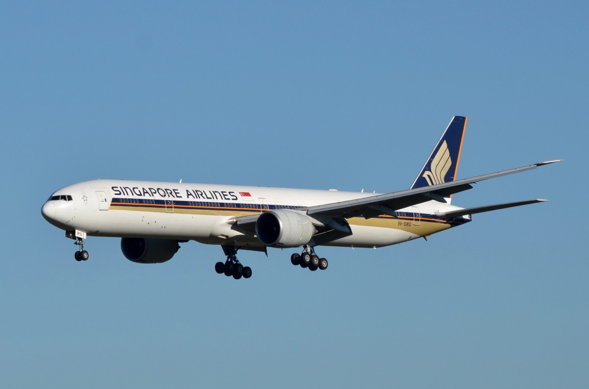 9V-SWG Singapore Airlines Boeing 777-312(ER) beim Landeanflug auf München am 07.12.2015