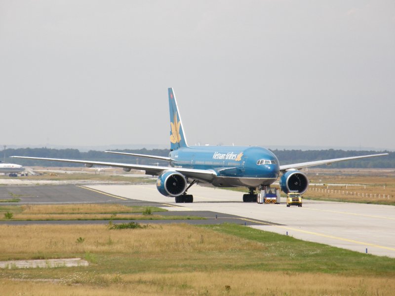 Eine Vietnam Airlines Boeing 777-200 auf dem Rollfeld des Flughafens Frankfurt am Main am 07.08.2008.