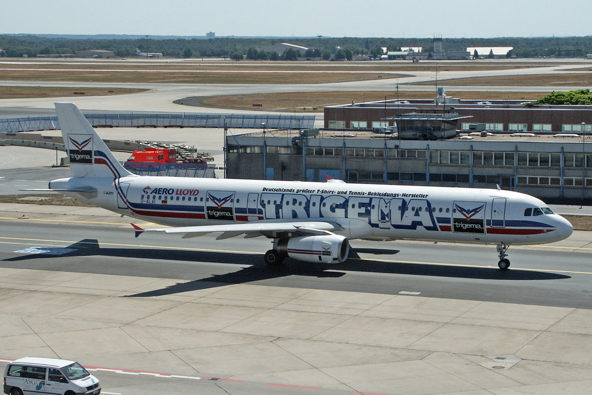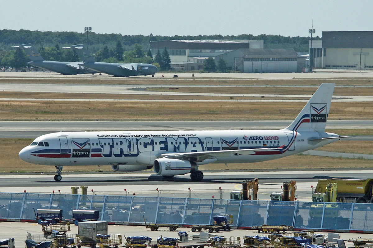 Aero Lloyd, D-ALAI, Airbus A321-231, 19.Juli 2003, FRA Frankfurt, Germany. Mit "Trigema" Bekleidungs Werbebemalung.
