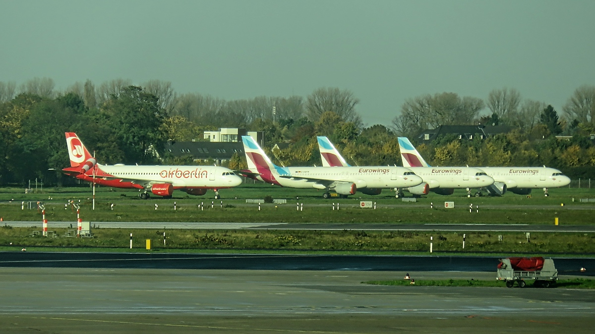 Eine einsame Maschine der verflossenen Air Berlin, zusammen mit drei Eurowings-Maschinen (vorne: D-ABFR - Airbus A320), abgestellt in DUS, 13.11.17 Pat_42