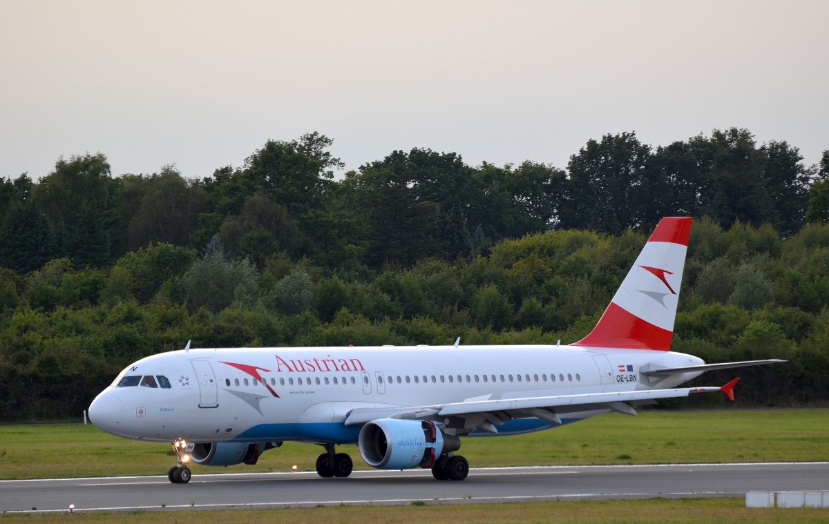 Der Austrian Airbus A320 OE-LBN mit dem Namen Osttirol nach der Landung in Hamburg Fuhlsbüttel am 28.08.14