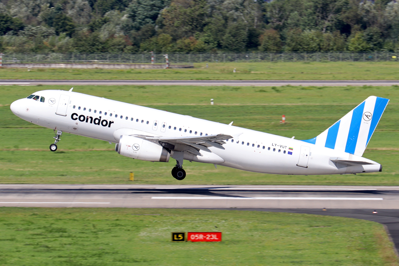 Condor Airbus A320-232 LY-VUT betrieben von Heston Airlines beim Start in Düsseldorf 24.8.2024