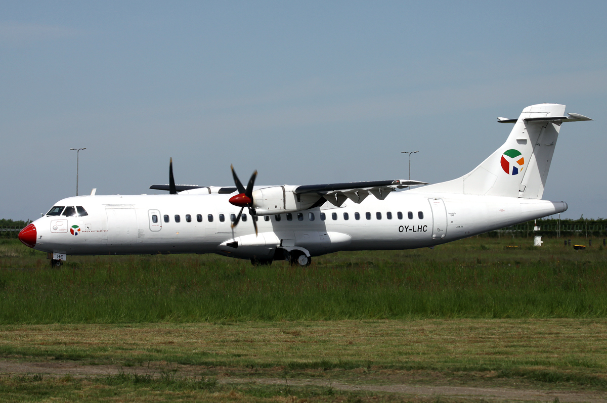 Danish Air Transport (DAT) Aérospatiale ATR-72-202 OY-RUB rollt zum Start als Flug DTR 4571 nach Salzburg; Dresden-Klotzsche, 09.05.2008