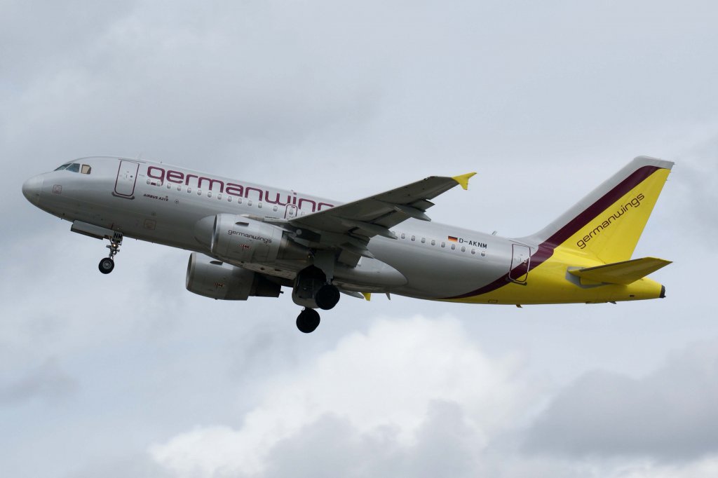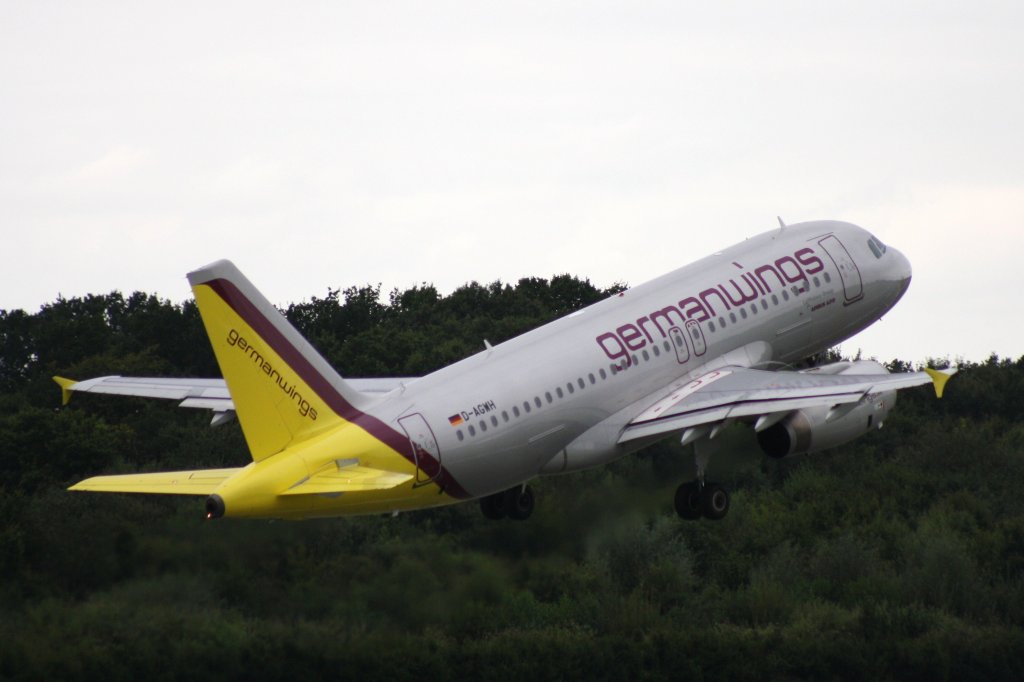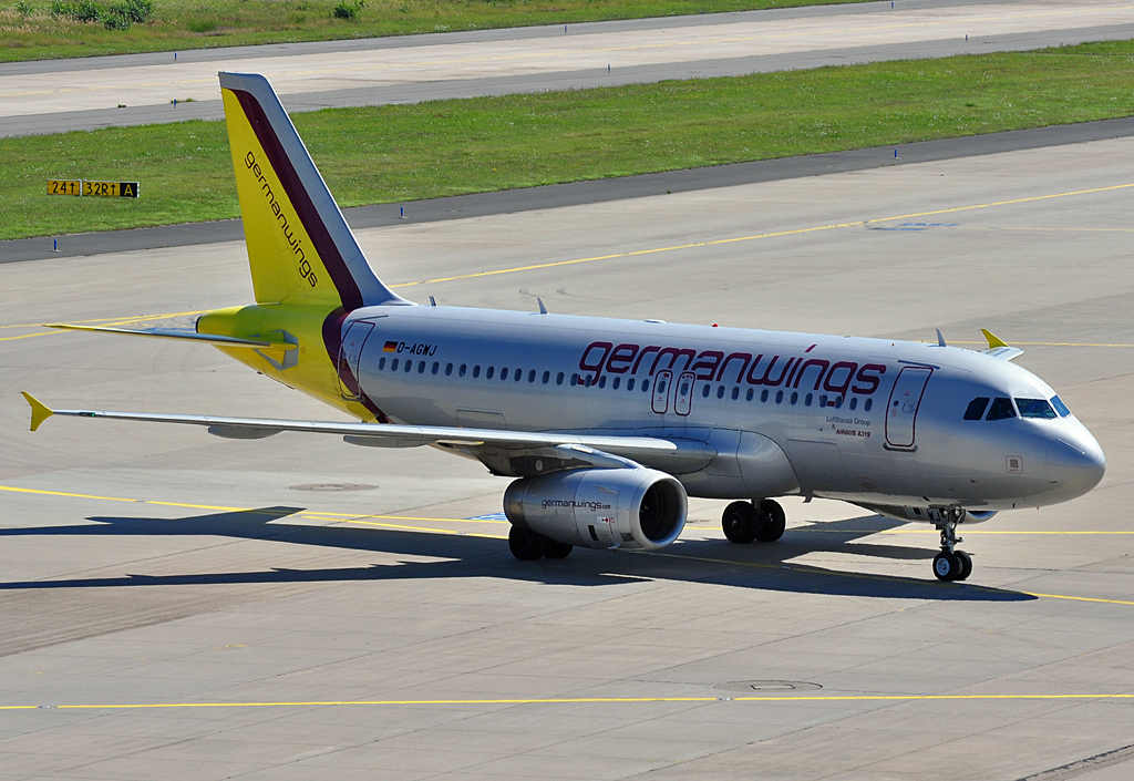 Der Airbus A 319 von Germanwings hat seine Parkposition am Terminal 1 verlassen, um zum Start zu rollen. Im Hintergrund diverse Frachtflugzeuge, die für den Nachtflug beladen werden. (Aufnahme 27.08.2012). Hans-Gerd Seeliger