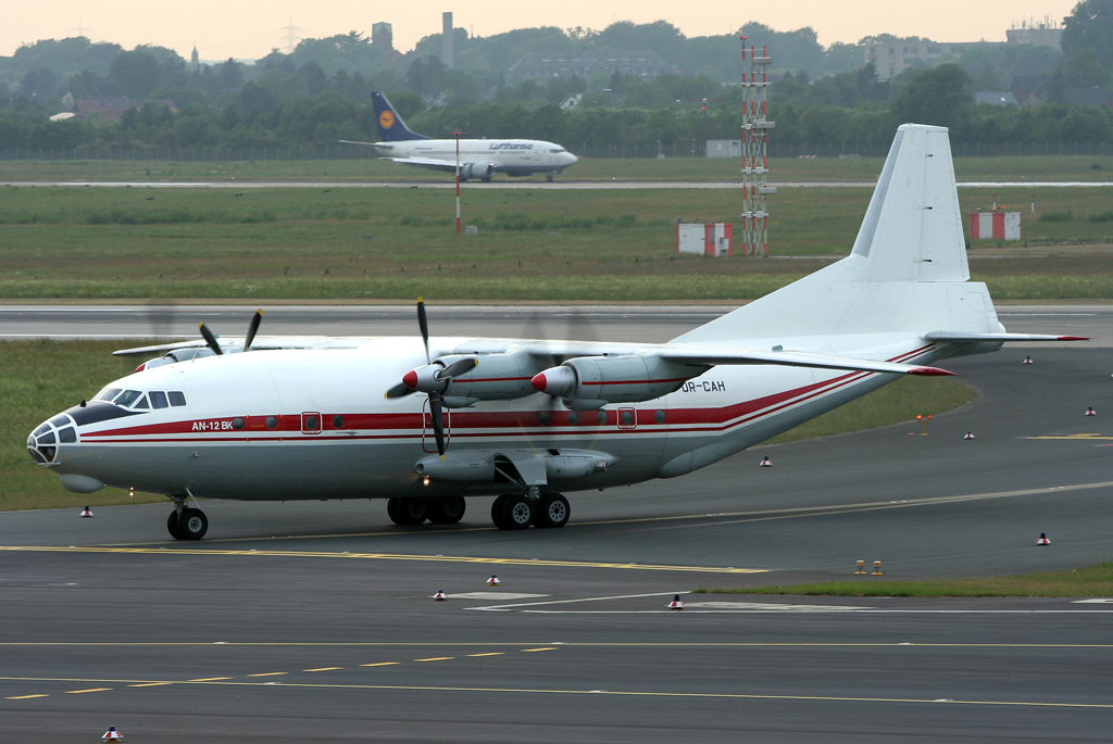 Meridian An-12 UR-CAH beim Verlassen der 05R in DUS / EDDL / Düsseldorf am 19.05.2011