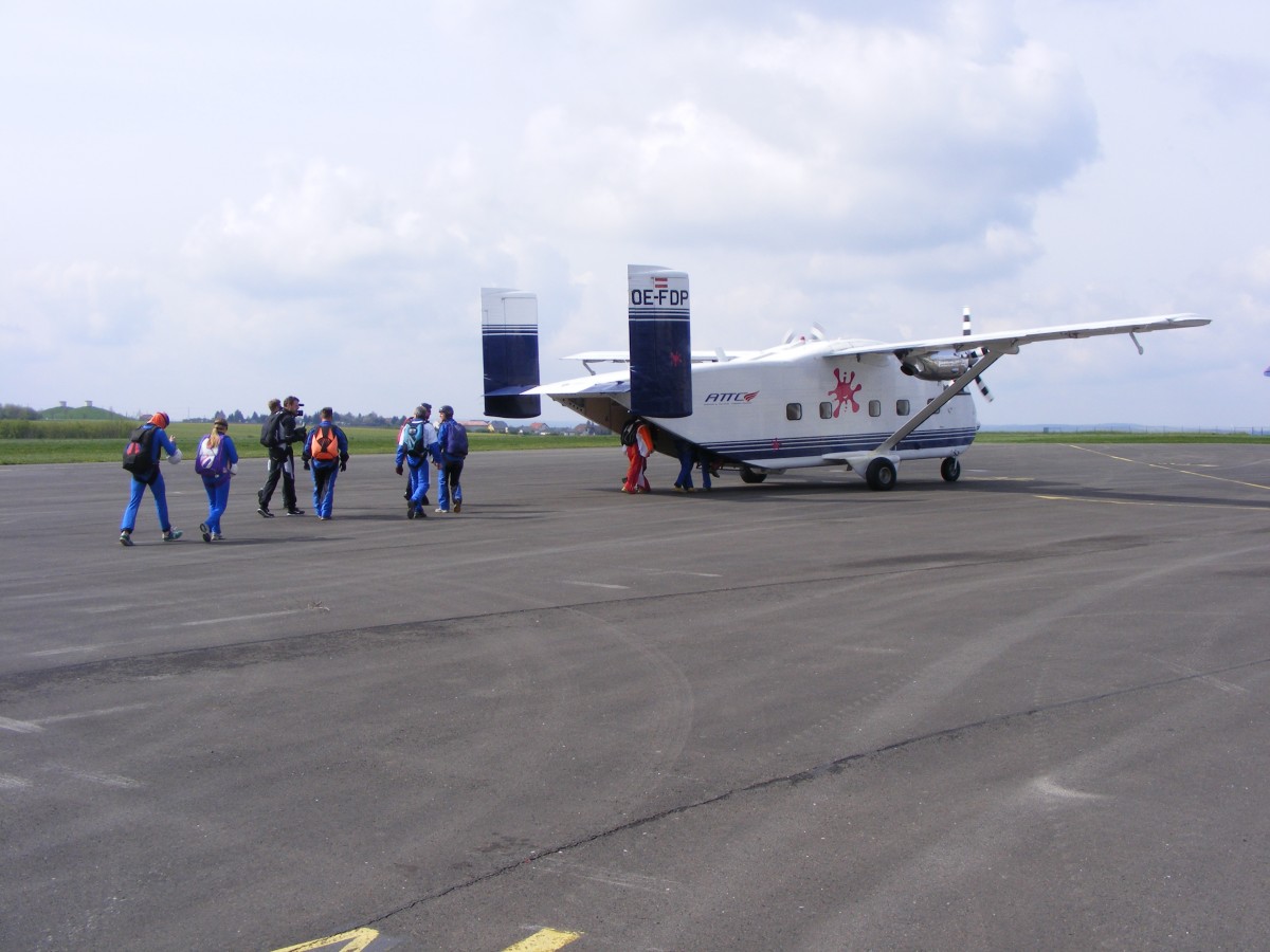 OE-FDP, Short SC-7 Skyvan beim einsteigen der Fallschirmspringer in Gera (EDAJ) am 1.5.2015