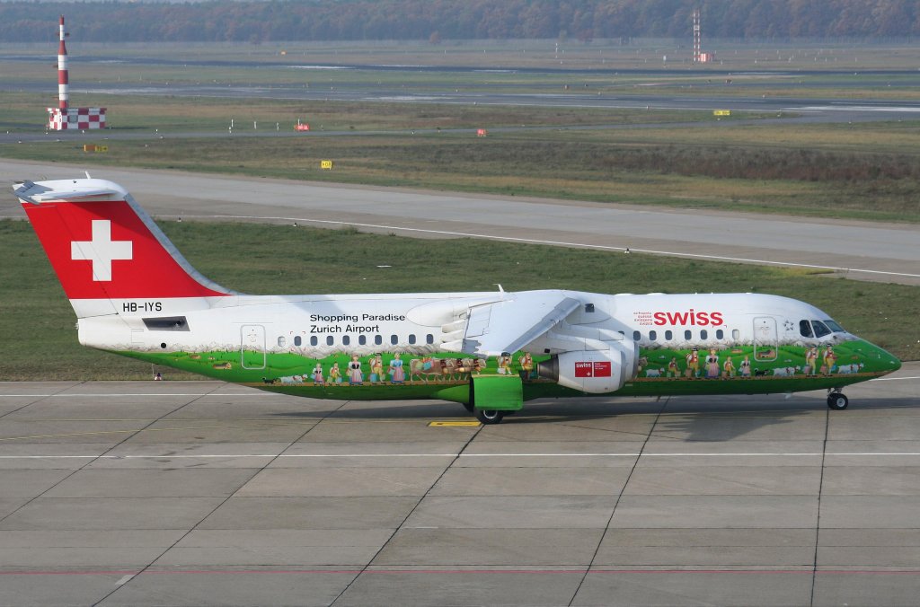 Swiss Avro RegJet RJ100 HB-IYS "Shopping Paradise Zurich Airport " auf dem Weg zum Start in Berlin-Tegel am 01.11.2009