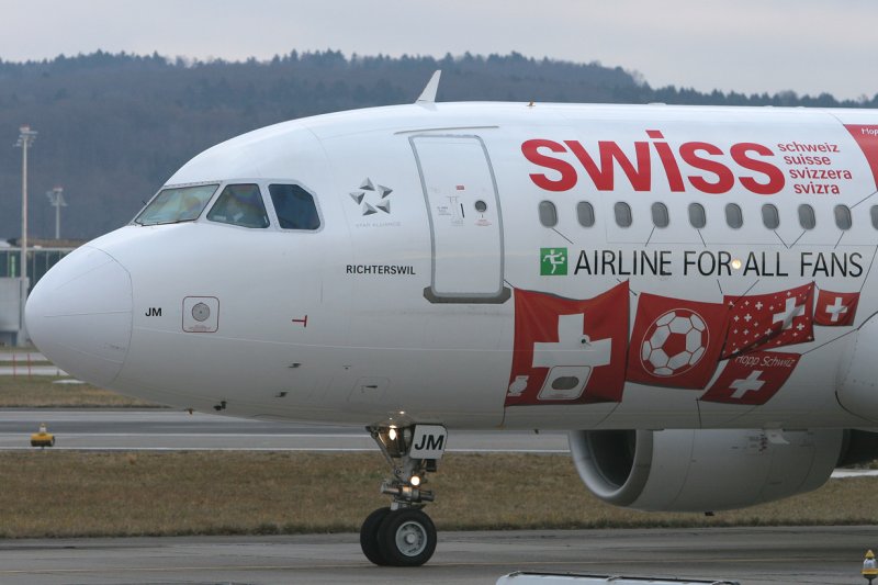 Die HB-IYU rollt von der Bahn ab. Spoiler und Bremsklappen im Heck sind noch geöffnet. Das Flugzeug trägt die Sonderlackeirung der Star Alliance. Das Foto stammt vom 13.05.2007 Martin Kramer