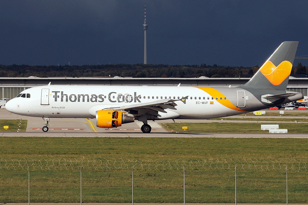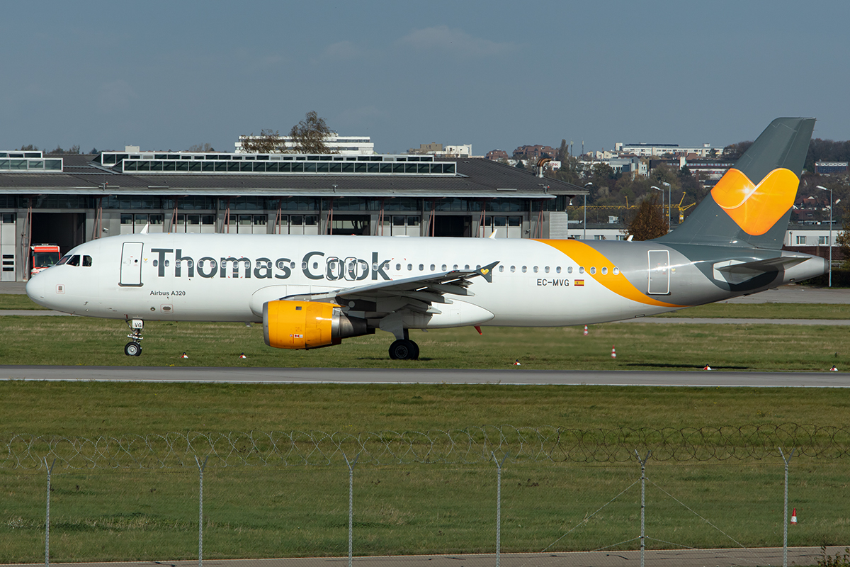 Thomas Cook Balearics Airbus A320-212 EC-MVF bei der Landung in Düsseldorf 4.5.2019