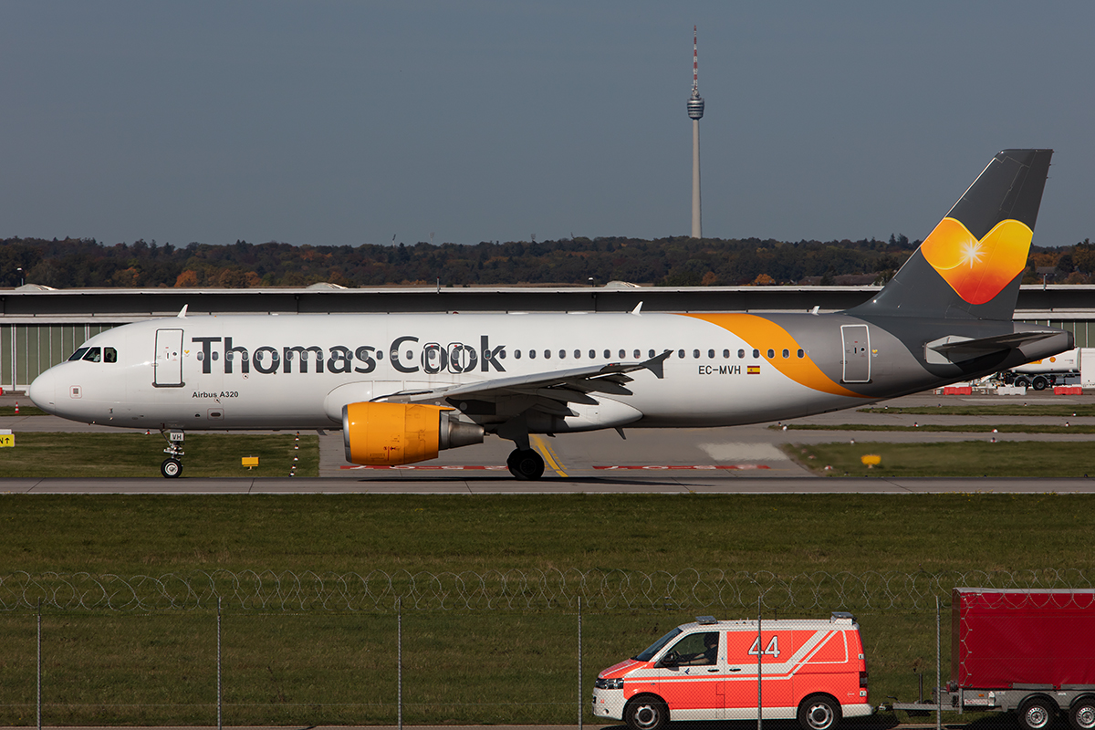 Thomas Cook Airlines Balearics Airbus A320-212 EC-MVG wird zu seiner Abstellposition geschleppt wo er wohl länger verweilen wird wie man auf dem Bild erkennen kann in Düsseldorf 10.10.2020