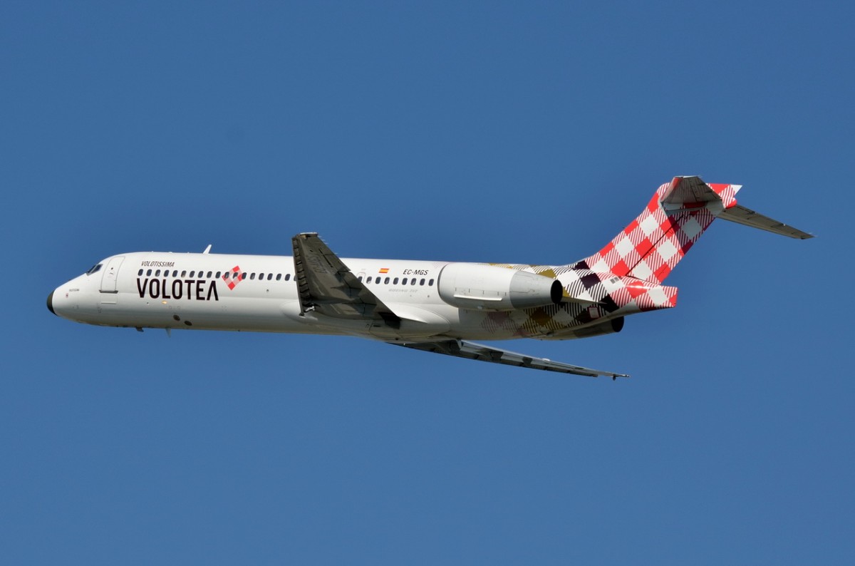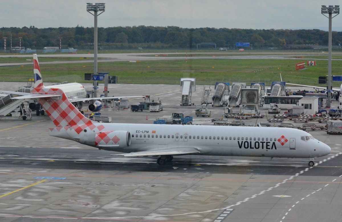 Boeing 717-2BL (EC-LPM) von Volotea Airwlines in Frankfurt /Main  zum Start bereit am 16.10.2014.