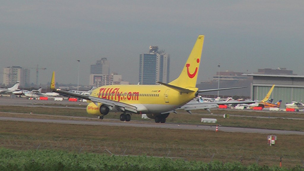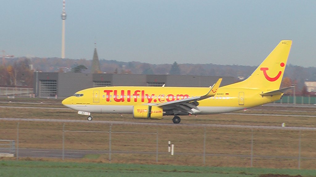 Boeing 737-700 der TUIfly beim Umkehrschub auf der Bahn 26 in Stuttgart