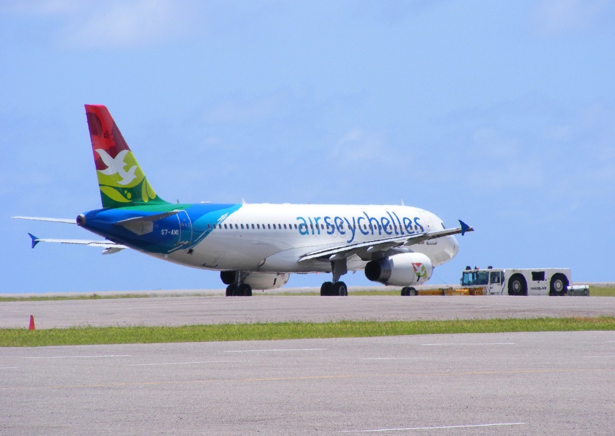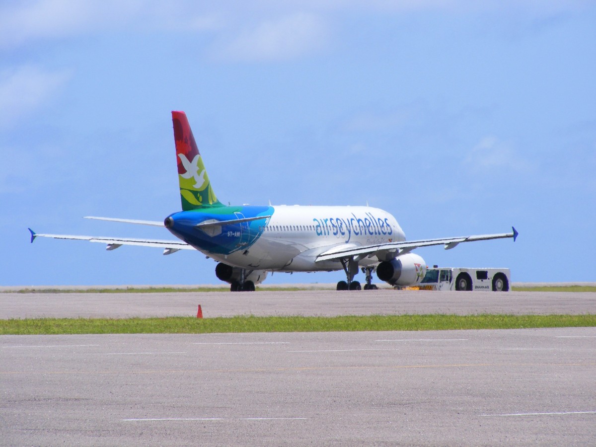 Air Seychelles, S7-AMI, Airbus A320, am Schlepper auf dem Seychelles International Airport (SEZ), 1.10.2015