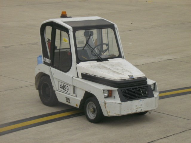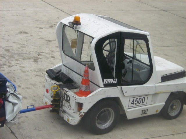 Ein Bild vob einem Gepäckwagenzieher am Flughafen in Sevillia.