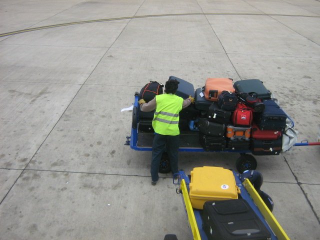 Ein Bild von einem Gepäckwagen und einem Lotse beim Beladen