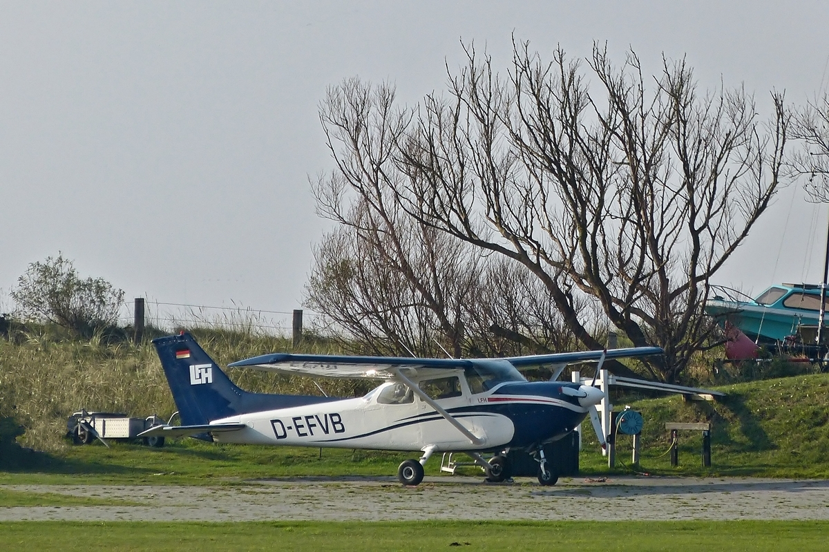 . Cessna FR172K Hawk XP des Luftverkehr - Friesland - Harle, wartet auf dem kleinen Flugplatz der Insel Baltrum auf ihren nächsten Einsatz . 06.10.2014 De Rond Hans und Jeanny