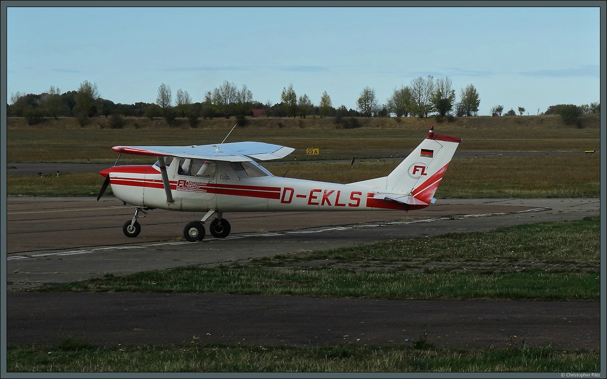 D-EKLS, eine Cessna F-150 der Flugschule Löffler, am Flugplatz Halle-Oppin. (19.10.2018)