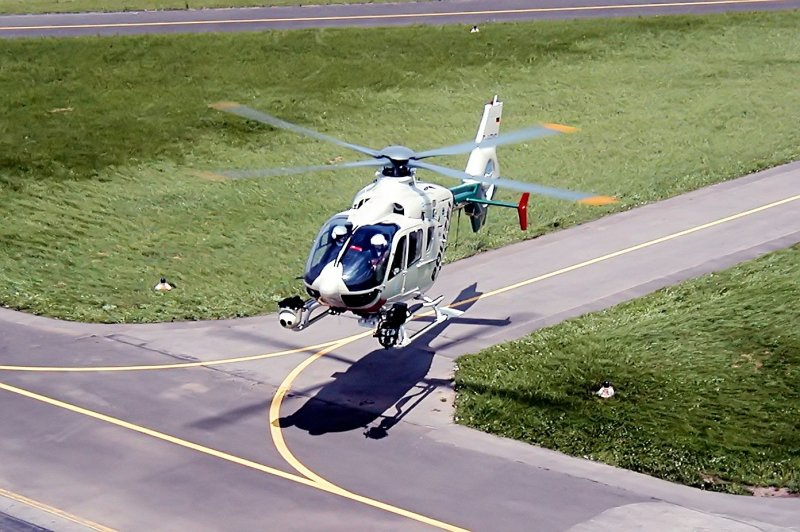 EC 135 der Polizei Bayern - Schwebeflug zur Tankstelle in Hassfurt - Juni 2002