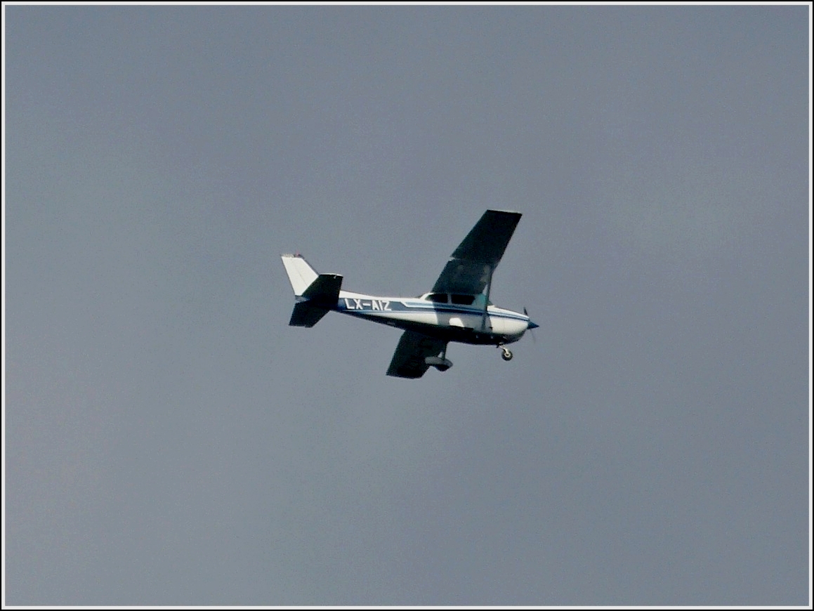 Bei dunkelen Gewitterwolken ist das Sportflugzeug Gippsland GA-8 / LX-MDT vor kurzem vom Flugfeld in Noertringen gestartet, an Bord sind 2 Fallschirmspringer welche sie auf die Absprunghöhe bringt. 07.07.2012 De Rond Hans und Jeanny