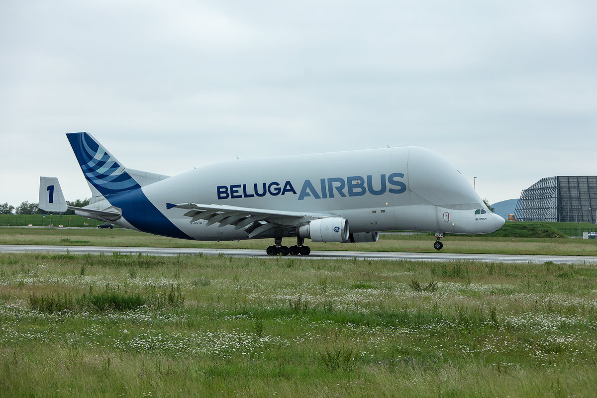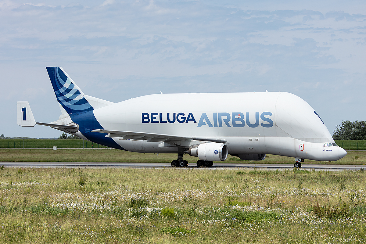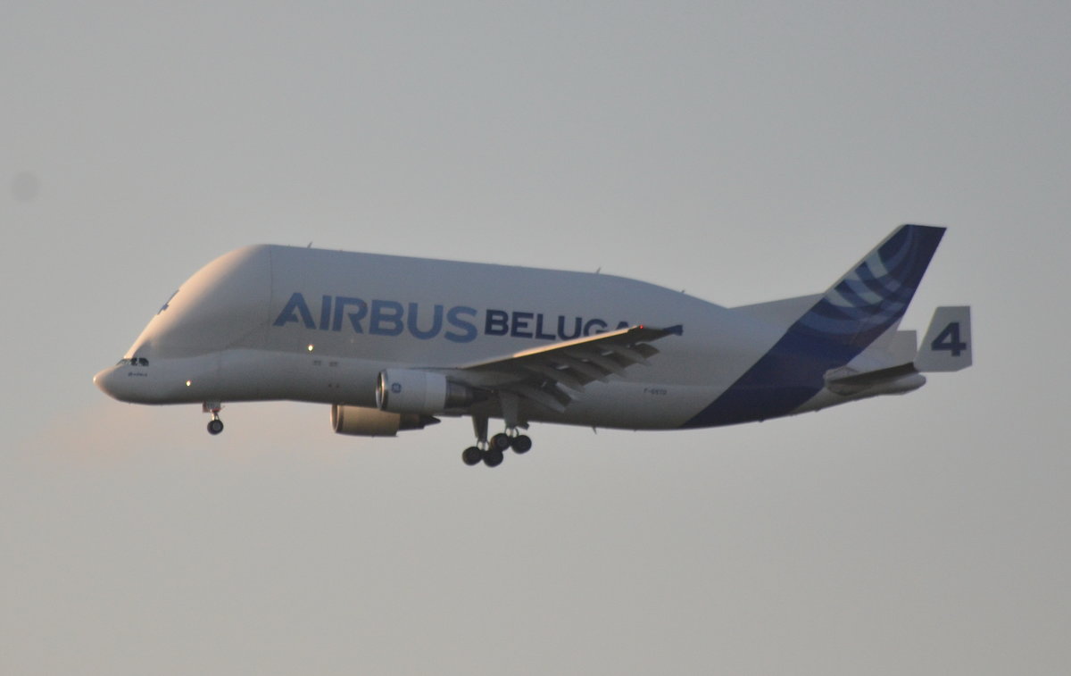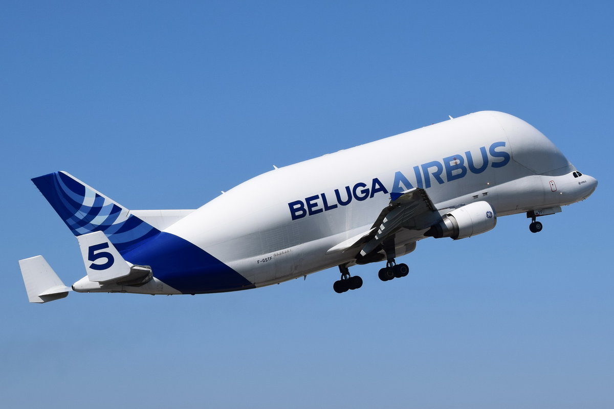 Der Airbus A300-600ST Beluga 4 fliegt am 12.09.2019 gerade bei Finkenwerder über die Elbe. Reg.: F-GSTA.