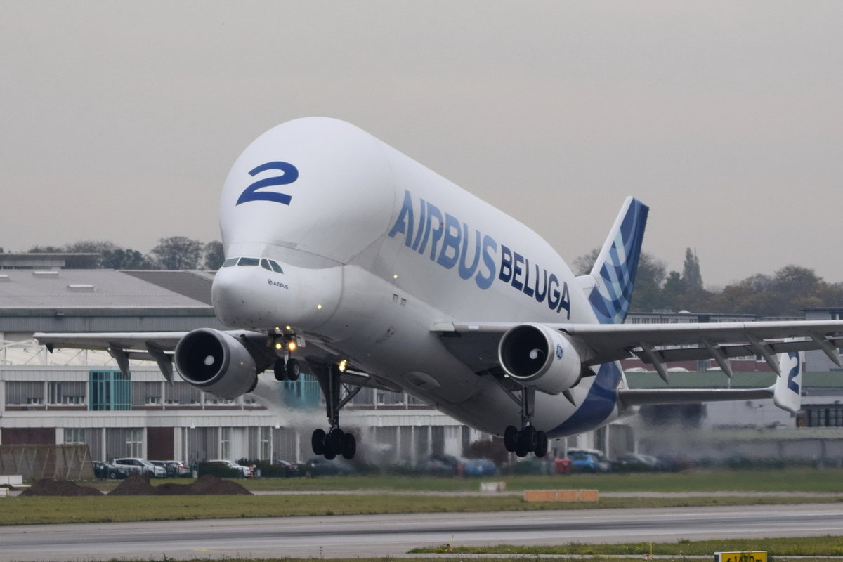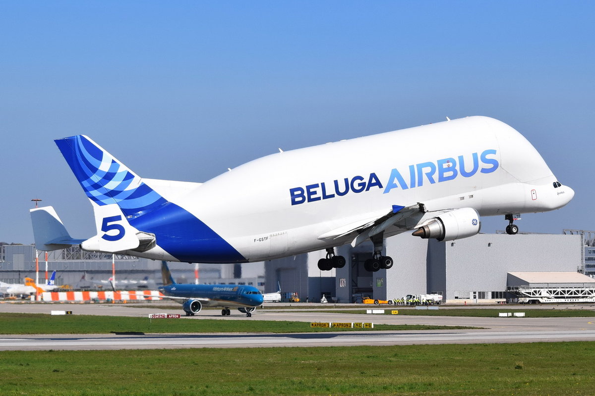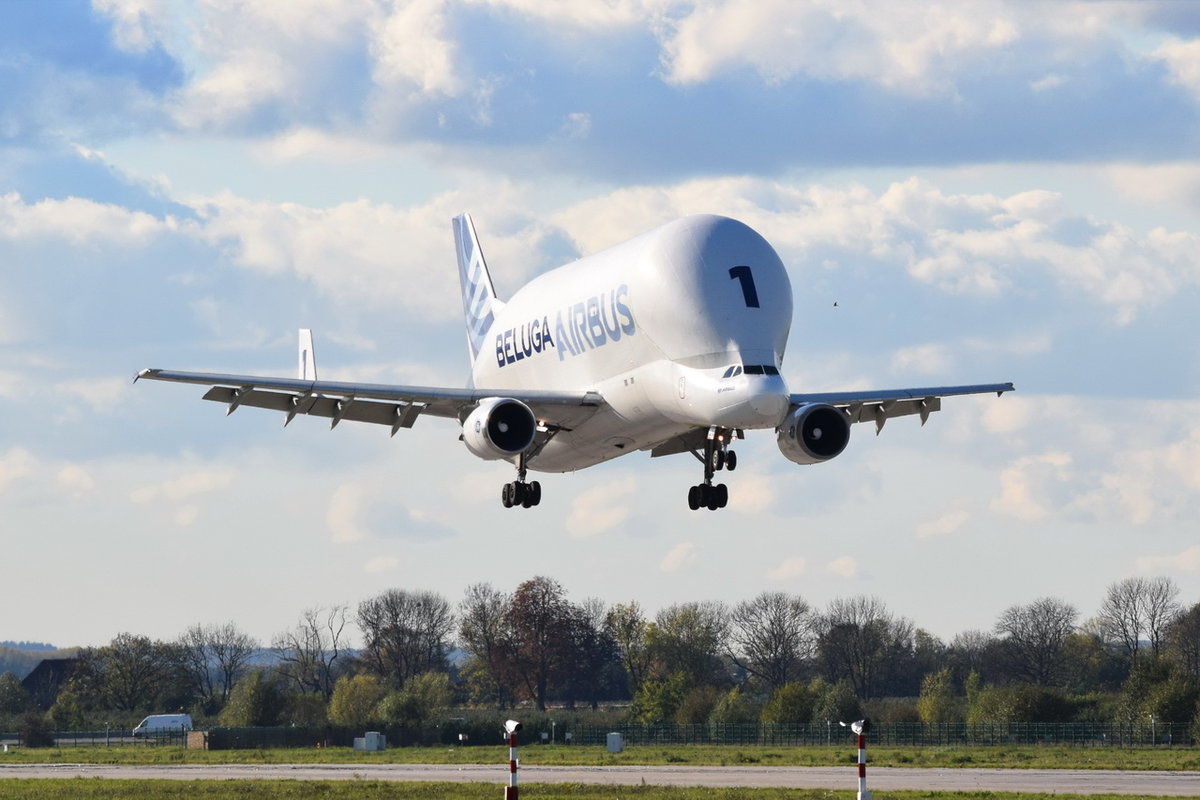 Der Airbus A300-600ST Beluga 4 fliegt am 12.09.2019 gerade bei Finkenwerder über die Elbe. Reg.: F-GSTA.