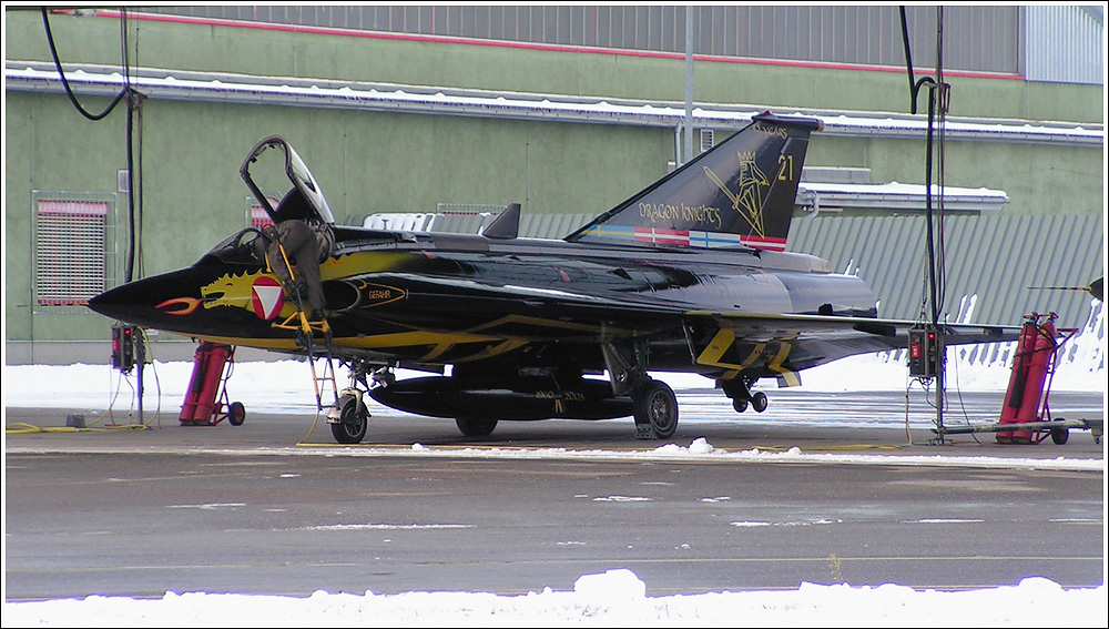 Sicher eines der Highlights bei der Airpower16 - eine Formation mit allen düsengetriebenen Flugzeugtypen, die je beim österr. Bundesheer geflogen sind bzw. (Saab 105 und Eurofighter) noch immer fliegen. De Havilland Vampire, Fouga CM.170 Magister, Saab 29 Tunnan, Saab 35 Draken, Saab 105OE, Northrop F-5E Tiger II und Eurofighter Typhoon. Nach drei Überflügen verabschiedete sich der Saab Draken mit Nachbrenner von der Formation und begann mit seinem Solodisplay. Hanspeter Reschinger