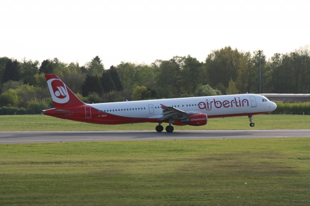 Ein Airbus A321 von Airberlin mit der Kennung  D-ABCB  im Anflug auf den Flughafen Stuttgart(STR).