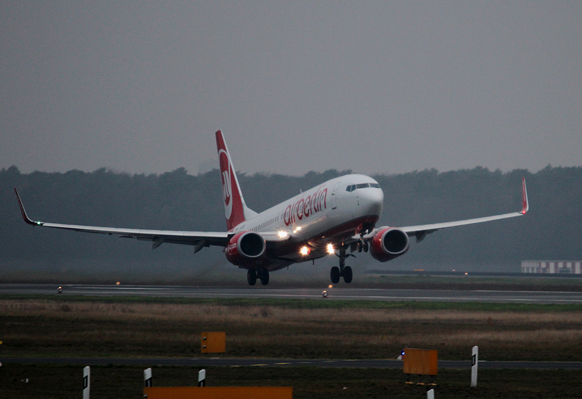Air Berlin B 737-86J D-ABMO beim Start in Berlin-Tegel am frühen Morgen des 29.11.2014