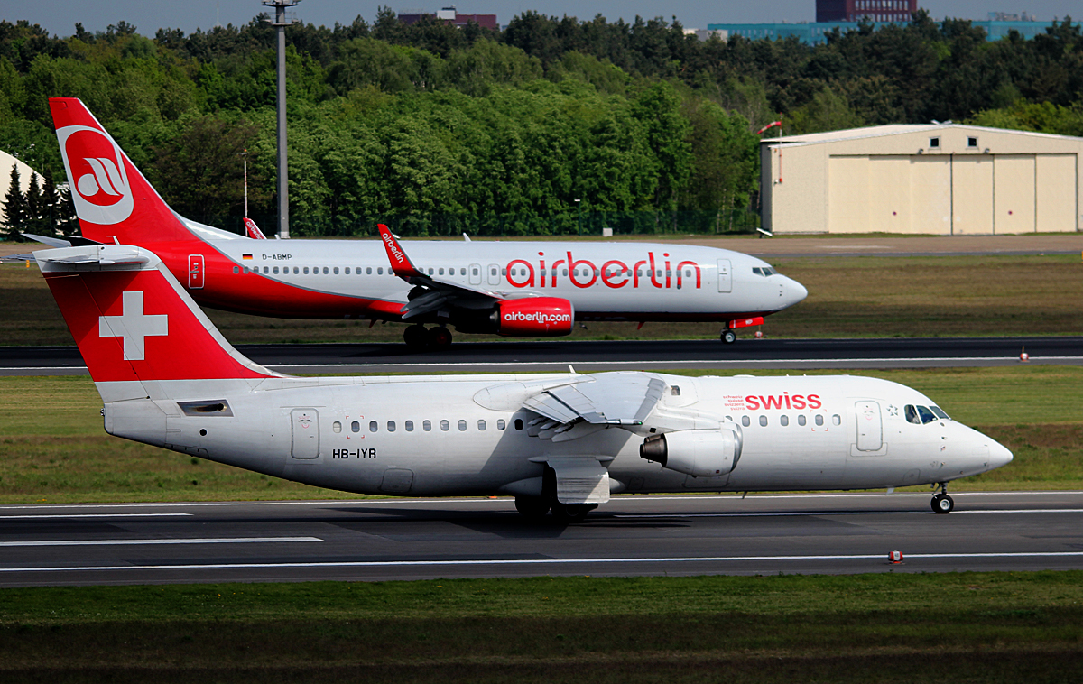 Swiss RJ100 HB-IYR beim Start in Berlin-Tegel am 27.04.2014. Air Berlin B 737-86J D-ABMP nach der Landung.