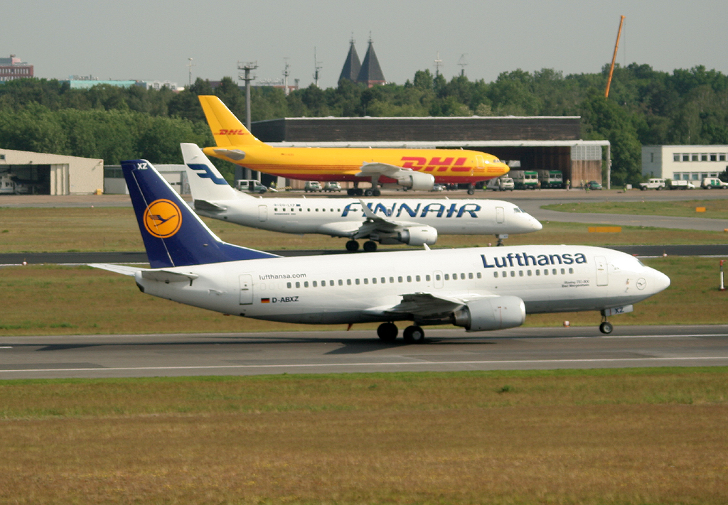 Lufthansa B 737-330 D-ABXZ beim Start, Finnair ERJ-190-100LR nach der Landung und DHL A 300 in Parkposition