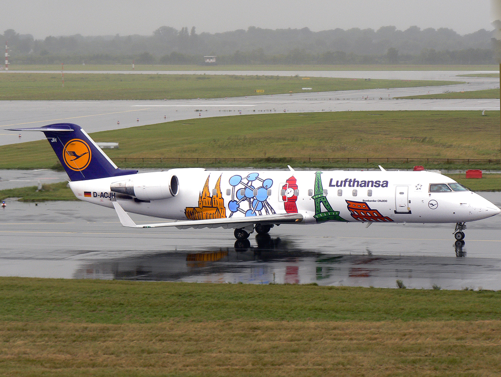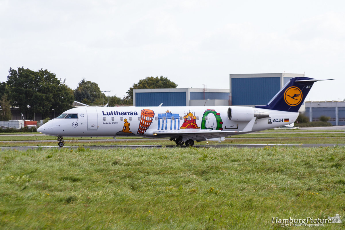 Lufthansa, D-ACJH, Canadair Jet 100. Der Regionaljet auf dem Weg zum Start mit Polizeibegleitung ? Foto von der Zuschauerterrasse am 14.7.2005. Jürgen Walter