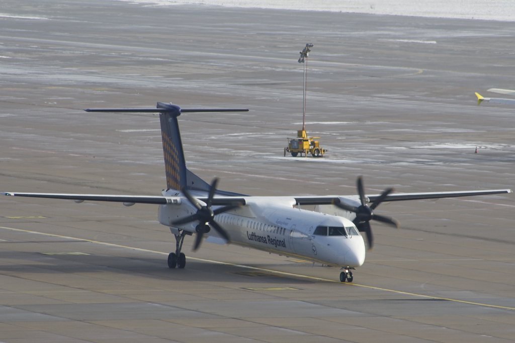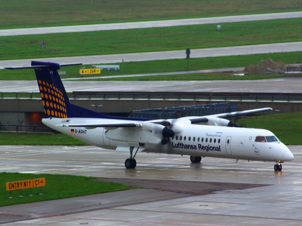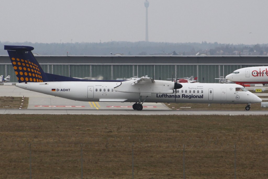 Eine Bombardier Dash 8 Q400 mit der Kennung D-ADHT der Augsburg Airways/Lufthansa Regional auf dem Vorfeld des Flughafens Leipzig/Halle. Fotografiert am 01.06.2010. Christian Geschonneck