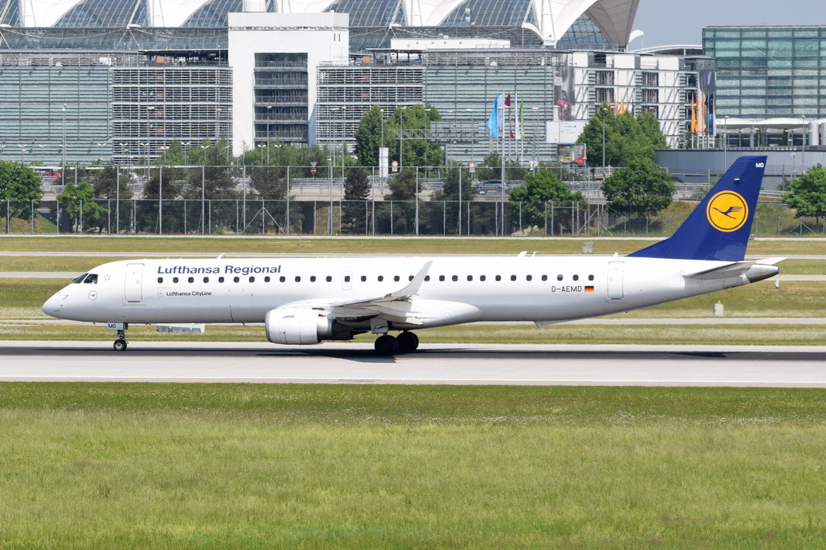 D-AEMD Lufthansa CityLine Embraer ERJ-195LR (ERJ-190-200 LR) in München am 14.05.2016 gestatet
