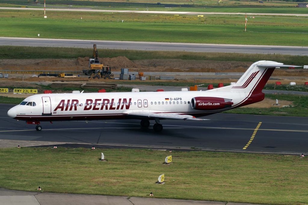 Eine Fokker der Air Berlin mit der Kennung D-AGPB (Taufname Spirit of Hinrich Bischoff) aufgenommen am 15.09.2007 am Züricher Flughafen. Frank Tribull