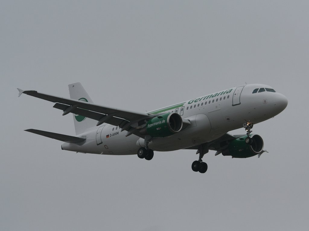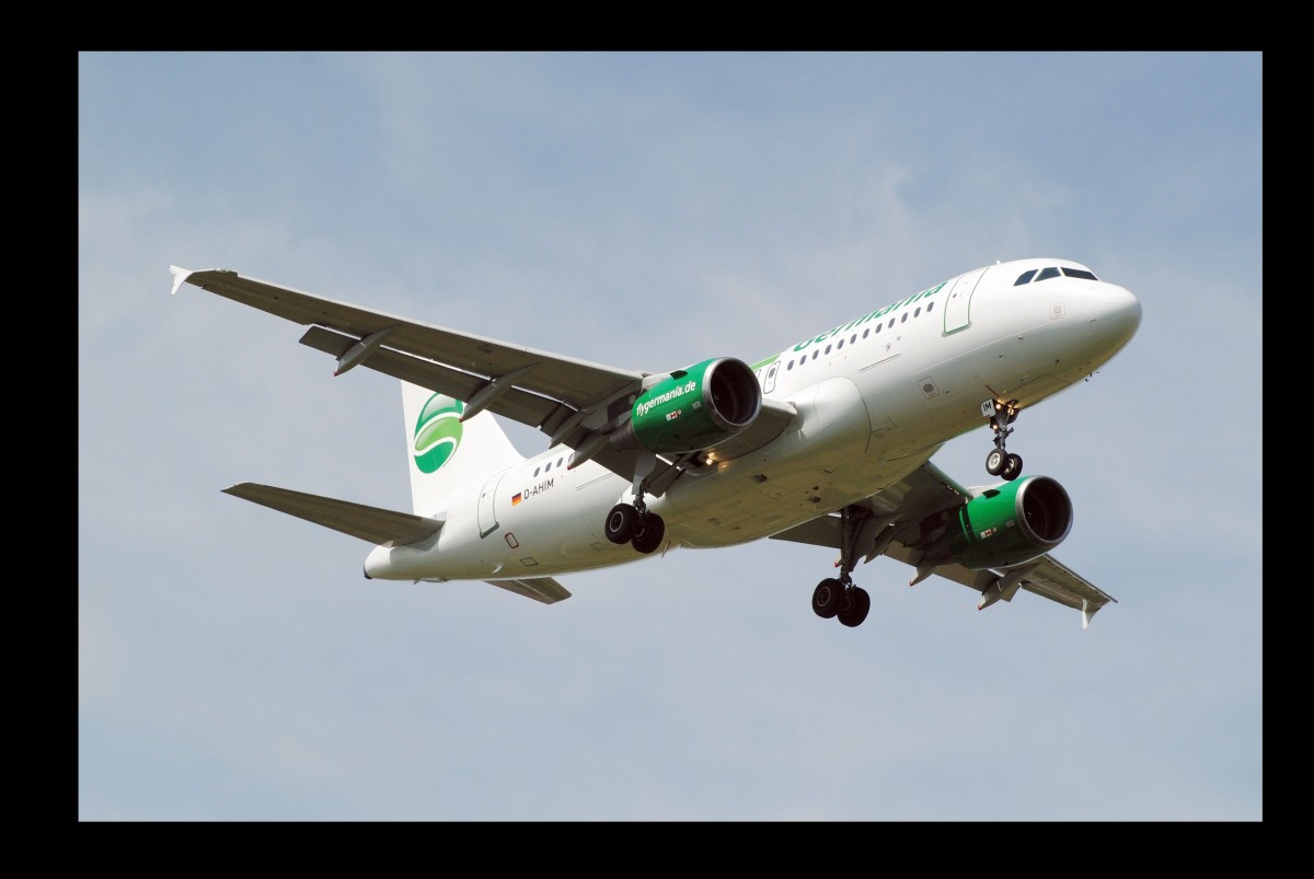 Ein Airbus A319 der Germania Airways mit der Kennung "D-AHIM" im Anflug auf den Flughafen Stuttgart(STR). Aufgenommen am 15.08.13