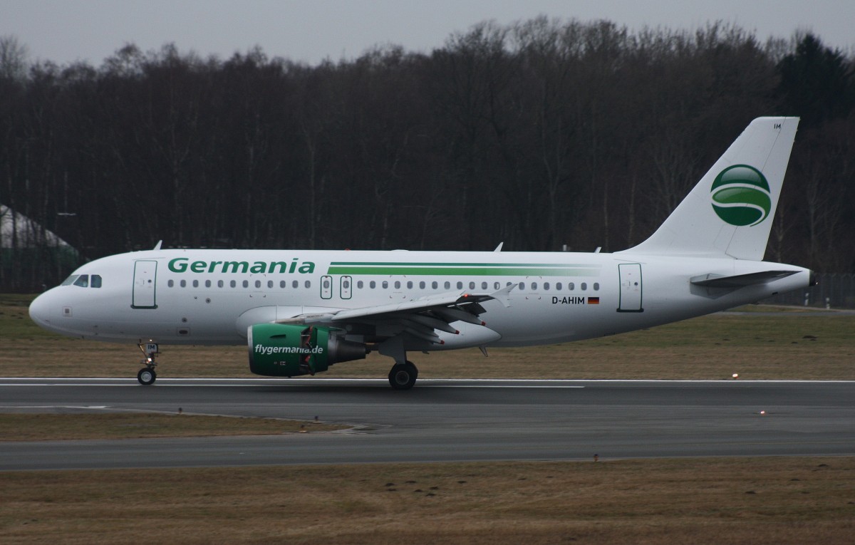 Ein Airbus A319 der Germania Airways mit der Kennung  D-AHIM  im Anflug auf den Flughafen Stuttgart(STR).