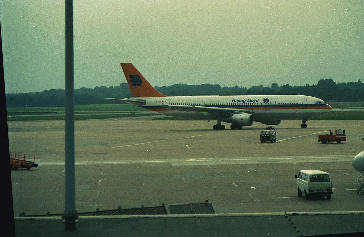 Hapag-Lloyd (HF), D-AHLB, Airbus A 310 C4-203, auf dem Vorfeld HH-Fuhlsbüttel, Foto: 1988, scan vom DIA, diese Maschine wurde am 10.1.1990 von HF übernommen, am 12.7.2000 – Flug 3378 von Kreta nach Hannover – mußte die Maschine wegen Treibstoffmangel in Wien notlanden und verunglückte dabei, Totalschaden, keine Todesopfer. Harald Schmidt