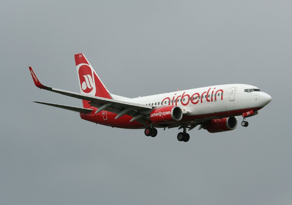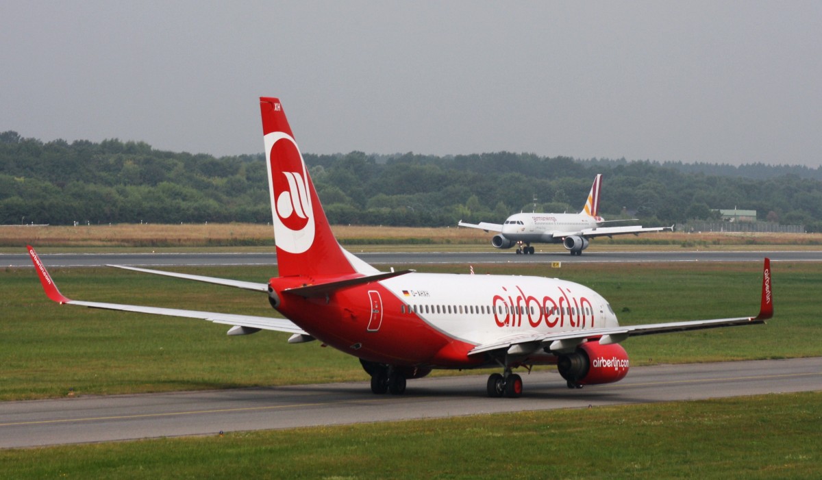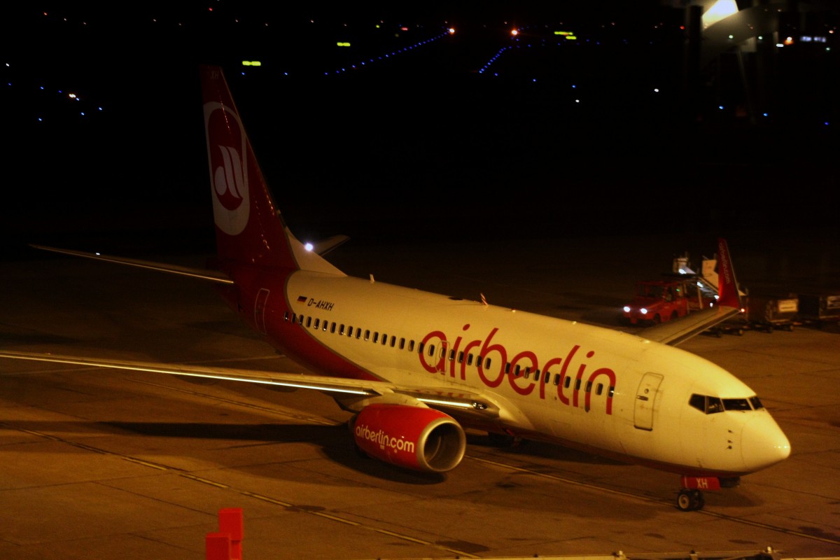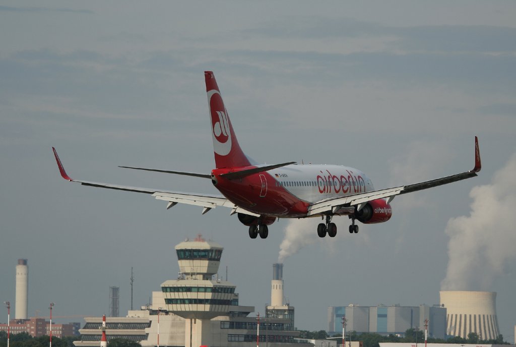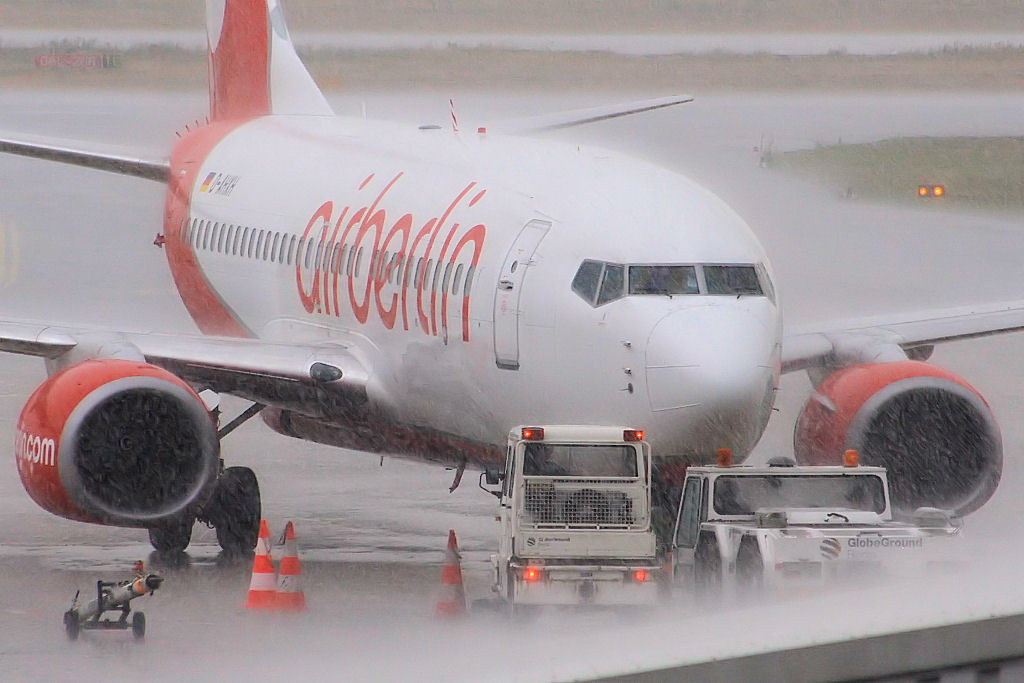 Die Air Berlin Boeing 737-7K5 D-AHXH auf dem Tegeler Flughafen bei einem weltuntergangähnlichen Unwetter am 18. Juni 2011. Im Hintergrund kann man auf der Runway erkennen, dass sich eine Wasserstraße gebildet hat. Matthias Weber