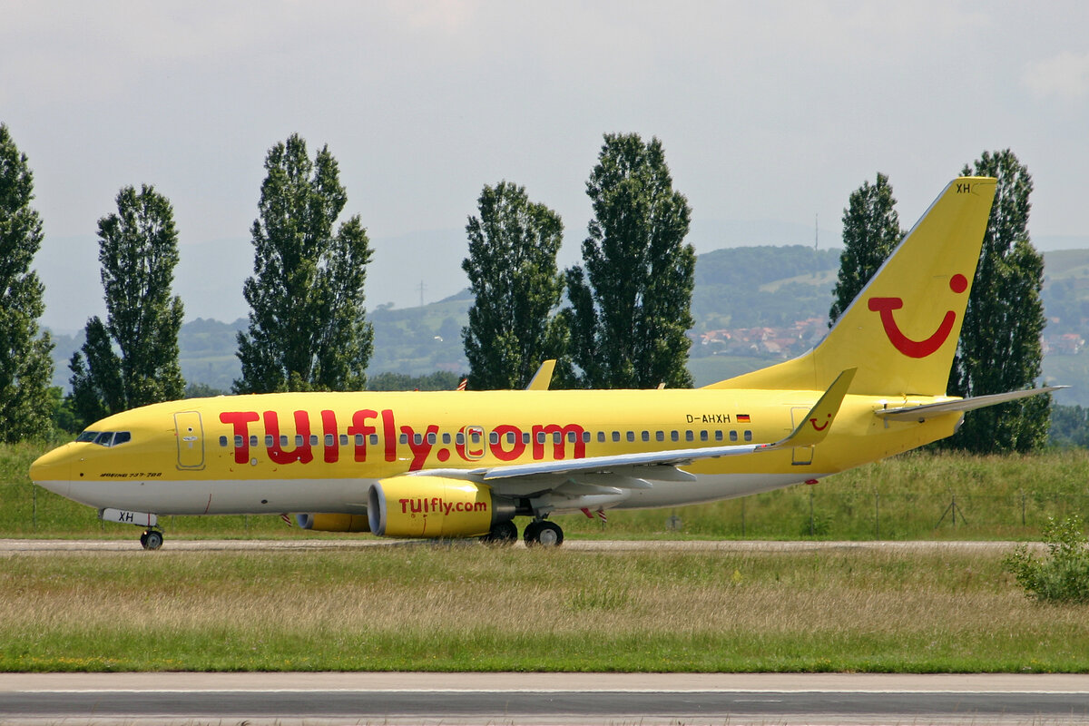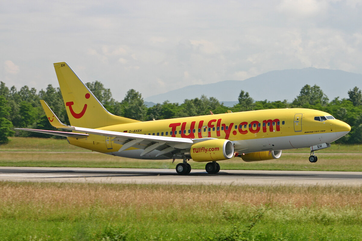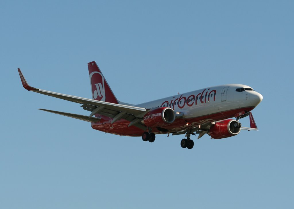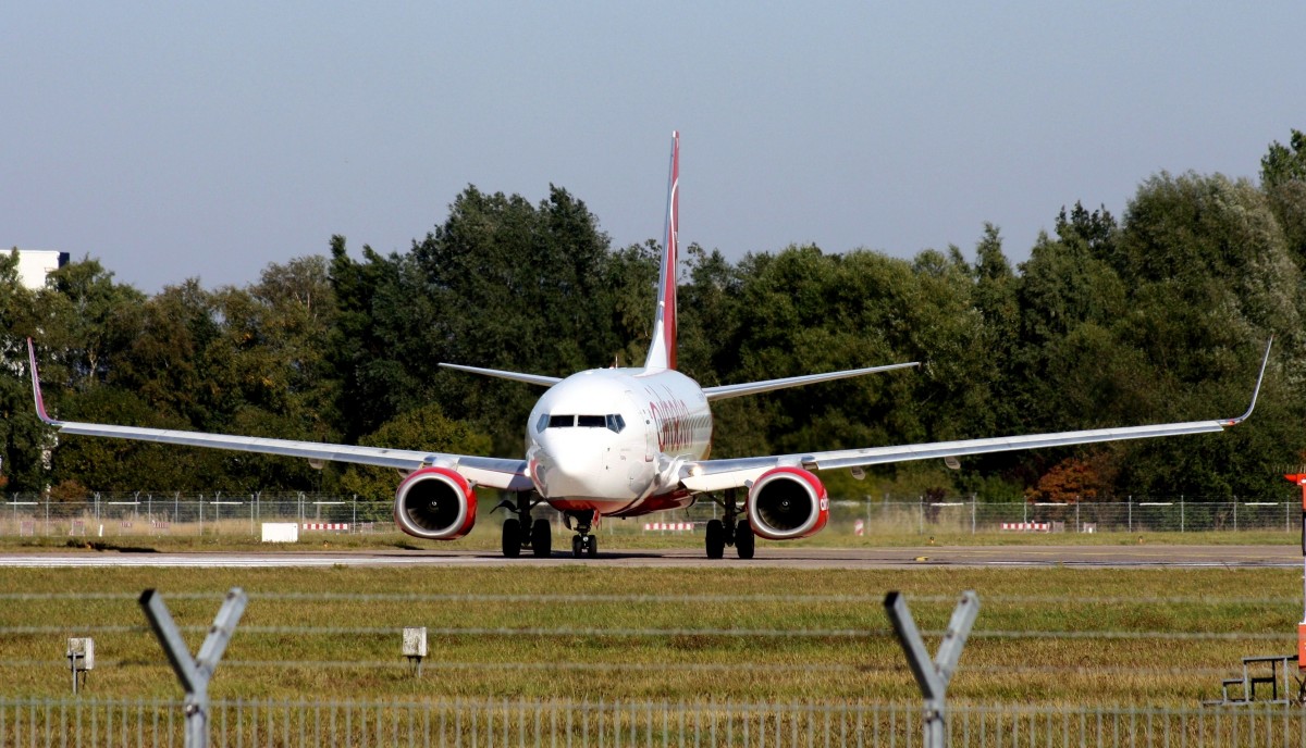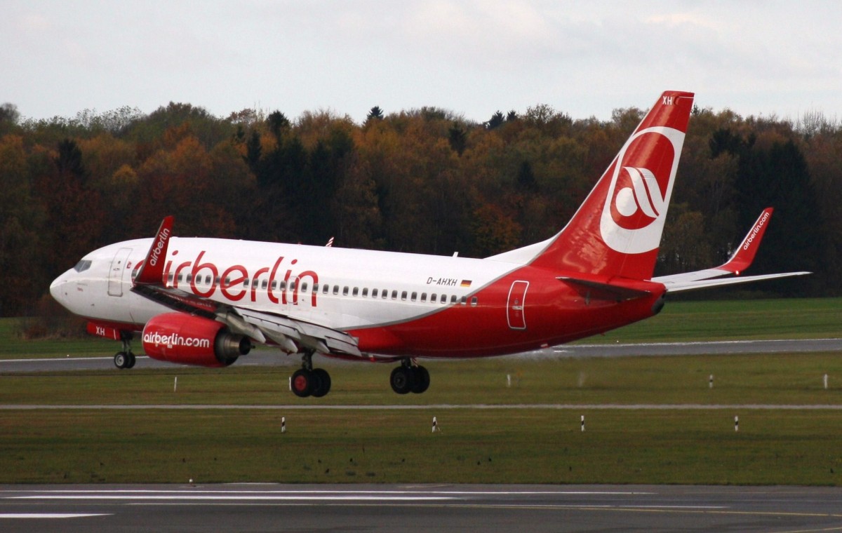 Die Air Berlin Boeing 737-7K5 D-AHXH auf dem Tegeler Flughafen bei einem weltuntergangähnlichen Unwetter am 18. Juni 2011. Im Hintergrund kann man auf der Runway erkennen, dass sich eine Wasserstraße gebildet hat. Matthias Weber