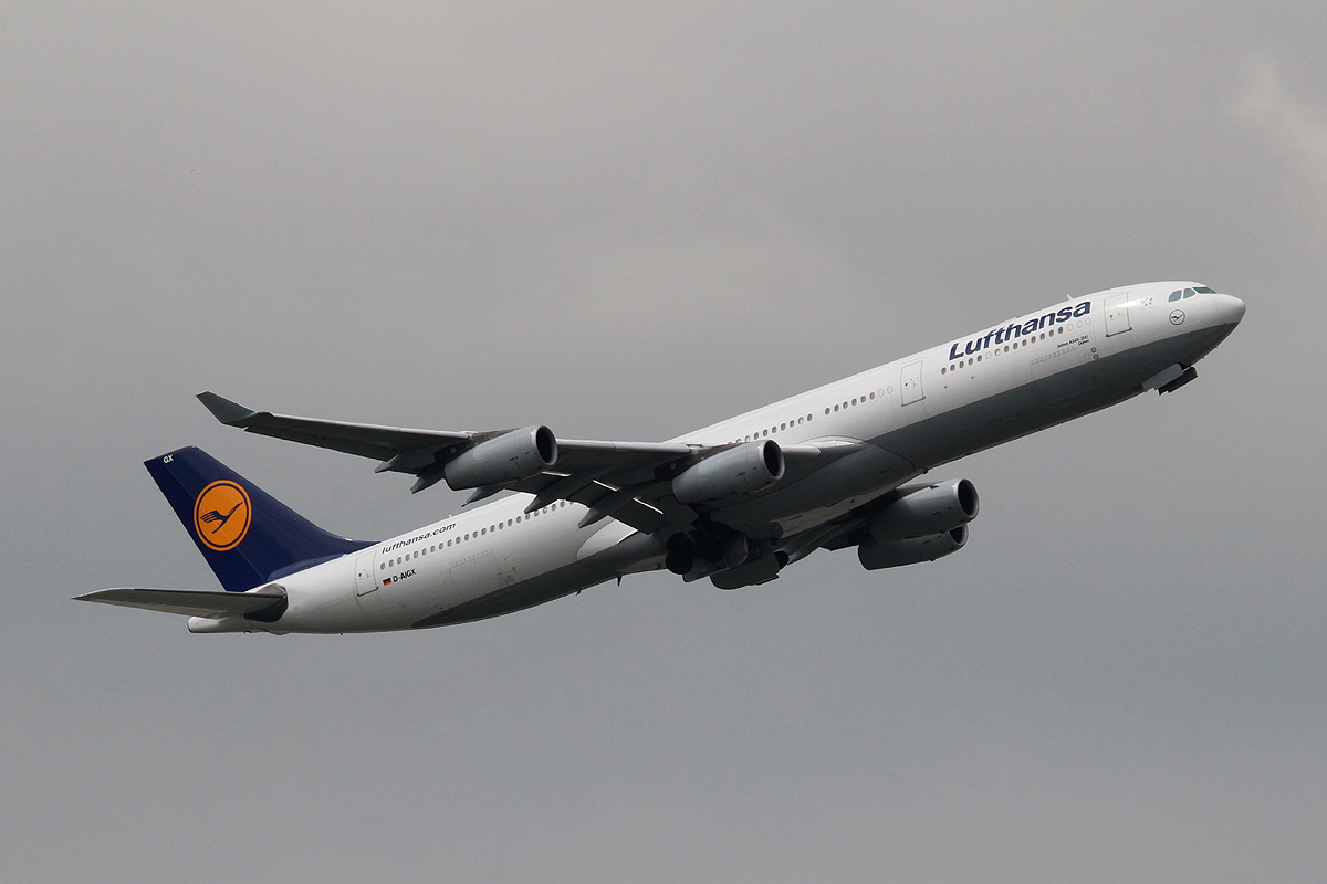 D-AIGX (A340-300) bei Start nach Miami in Düsseldorf.