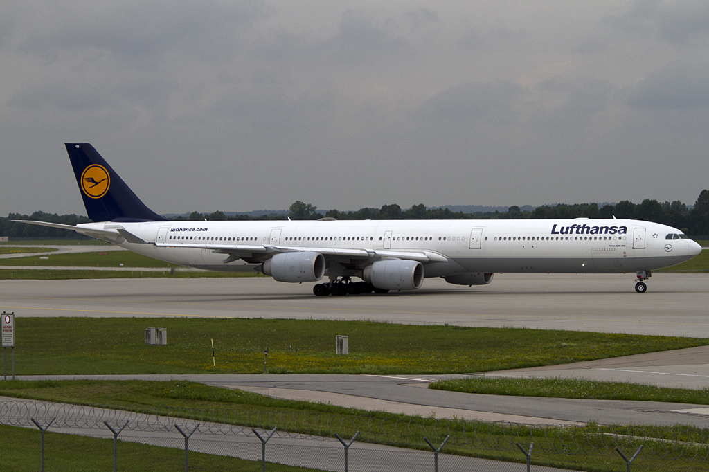Lufthansa, D-AIHN, Airbus A 340-600 (ohne Namen), 2009.06.20, MUC, München, Germany