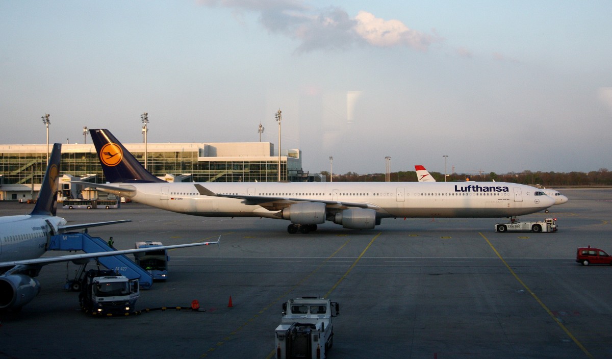 Lufthansa A 340-642 D-AIHR bei der Landung auf dem Flughafen München am 10.03.2008