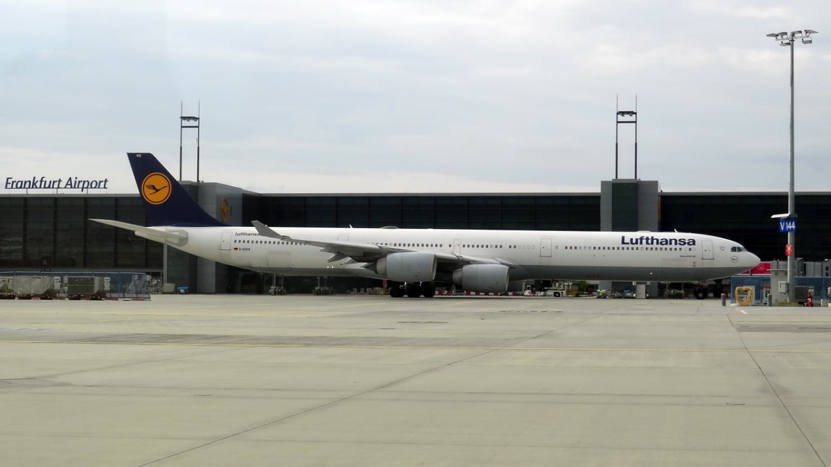 D-AIHX Lufthansa Airbus A340-642X 08.08.2013 Flughafen Frankfurt , aus dem Bus während einer Flughafentour