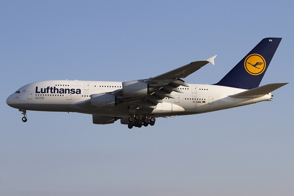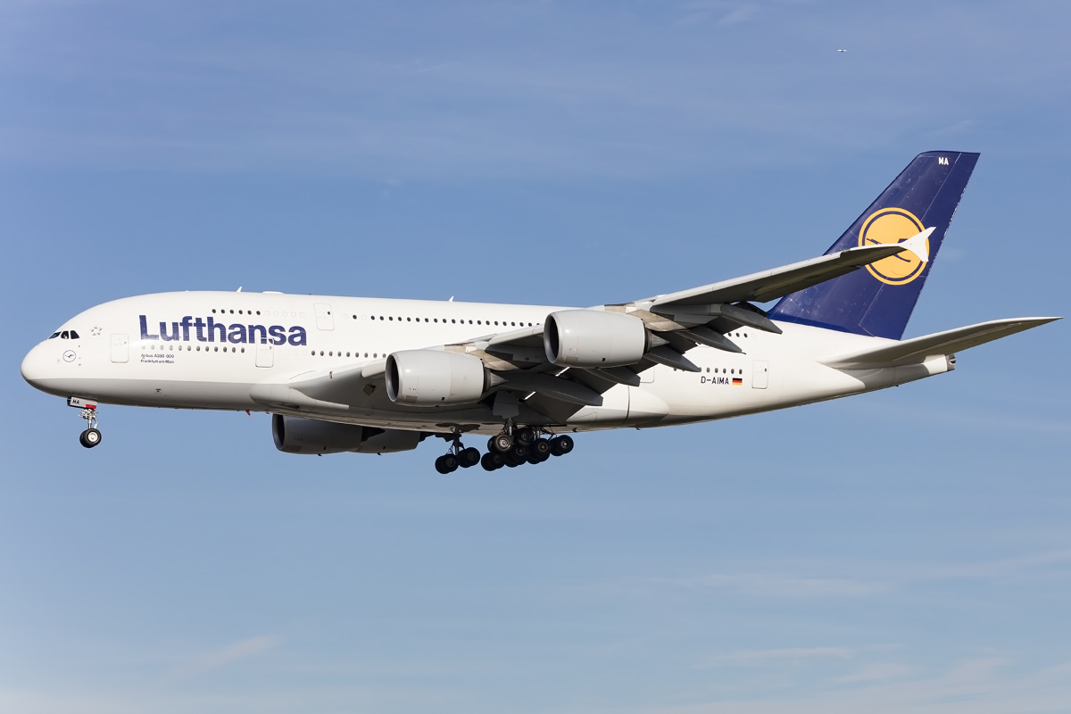 Nur im Dunst ist der Stuttgarter Fernsehturm zu erkennen, als die Lufthansa A380-800 Frankfurt am Main, D-AIMA zu ihrer Startposition rollt.